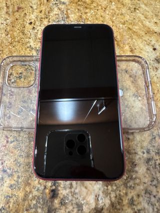 Teléfono móvil iPhone 11 en color rojo. En perfecto estado, excepto batería al 76%, usado hasta hace poco siempre con funda y protector, sin ningun tipo de problema. Todas las cámaras funcionan correctamente y el Face ID también. Solo se entrega el movil. - Pantalla de 6.1 pulgadas. - Sistema de cámara dual. - Chip A13 Bionic.