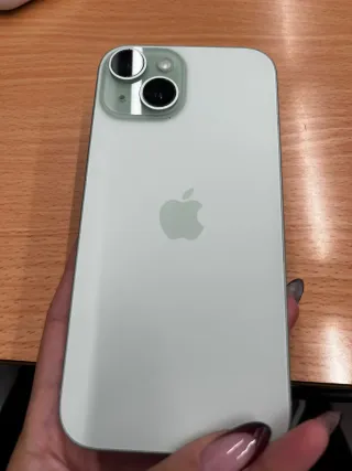 Teléfono móvil iPhone 15 en un bonito color verde pastel. - Pantalla de alta resolución , lleva el protector y por ello se ve así pero quitándoselo no tiene ni una raya . - El móvil tiene un año y medio , me lo compré a finales de julio del verano pasado . - podemos quedar en persona para que lo veas si es necesario - lo vendo con unas 10 fundas - 128GB - salud de la batería normal , a mi un 100% cargándolo por la noche me dura 7/8h