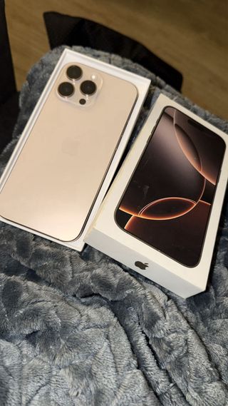 Teléfono móvil iPhone 16 Pro Max en color dorado. Con solo 8 meses de uso y la batería al 100%. - Capacidad de almacenamiento de 256GB.