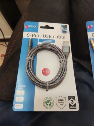 Vendo cable USB de la marca Sologic, compatible con iPhone, iPad y AirPods. Es de color dorado y tiene una longitud de 1.5 metros. - Cable USB 8 pines. - Diseño elegante y moderno. - Longitud: 1.5 metros. - Compatible con iPhone, iPad y AirPods (ver modelos compatibles en la parte trasera del embalaje). - Garantía de 3 años. - Fabricado con materiales reciclados (51%). - Resistencia a más de 50.000 flexiones.