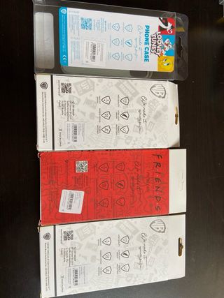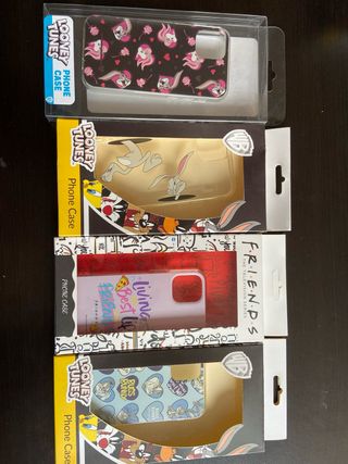 Varias fundas para iPhone 12 Mini con diseños de Looney Tunes y Friends. - Funda Looney Tunes con Bugs Bunny y otros personajes. - Funda Friends Living my best life. - Funda Looney Tunes con personajes femeninos y rosas.