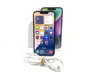 Teléfono móvil iPhone 14 con 128GB de almacenamiento en color morado. La batería tiene un 88% de salud. - Incluye cable de carga. - Se acompaña de auriculares inalámbricos y su caja.