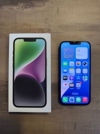 Teléfono móvil iPhone 14 en color negro con 128GB de almacenamiento. - Incluye cable de carga USB-C a Lightning. - Documentación de Apple. - sin reparaciones - tiene un pequeño golpe en la pantalla, con el protector de pantalla puesto es imperceptible