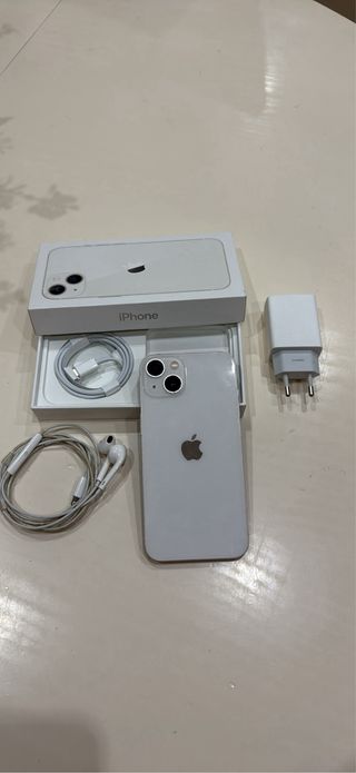 Teléfono móvil iPhone 13 en color blanco y con 128GB de almacenamiento. 83 salud de batería Regalo : cargador, auriculares y cable de carga.