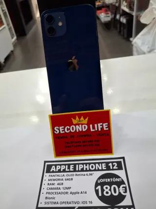 iPhone 12 en color azul con 64GB de almacenamiento. - Pantalla OLED Retina de 6,06 - 4GB de RAM - Cámara de 12MP - Procesador Apple A14 Bionic - Sistema Operativo iOS 16 - Batería al 83%