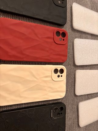 Lote de cuatro fundas para iPhone 11. - Funda negra con textura. - Funda roja con textura. - Funda color crema con textura. - Funda negra con diseño de mariposas.
