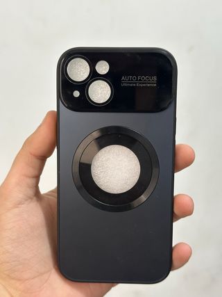 Funda protectora para iPhone 15 con diseño magnético. - Acabado mate en color negro. - Incorpora un anillo magnético en la parte trasera. - Diseño con módulo de cámara simulado y texto 'AUTO FOCUS'.