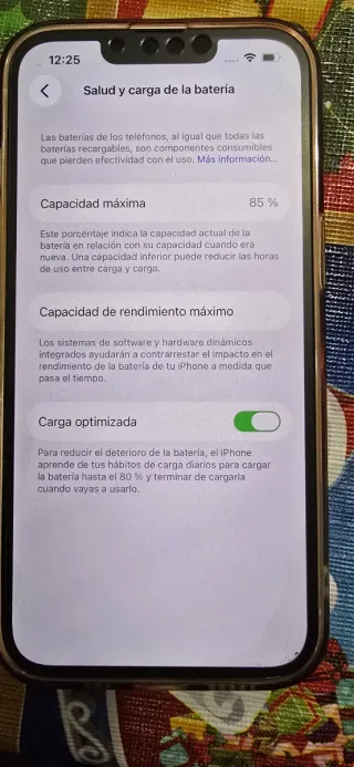 Detalles sobre la salud de la batería de un iPhone 13. - Capacidad máxima de la batería: 85%. - La carga optimizada está activada. Vendo teléfono usado pero bien cuidado, completamente nuevo, batería al 85%, no ha sido cambiada. Un sólo dueño, y lo vendo porque hemos comprado otro nuevo, vienen incluidas todas las fundas.