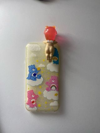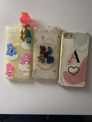 Lote de tres fundas para iPhone 7. - Funda transparente con diseño de osos Care Bears y estrellas. - Funda transparente con diseño de Harry Potter y escudo de Hogwarts. - Funda con diseño abstracto en tonos pastel y letra A.