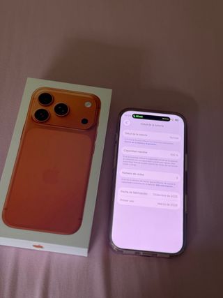 Teléfono móvil iPhone 17 Pro en color naranja y con 256GB de almacenamiento. - Capacidad máxima de batería: 100% - Número de ciclos de batería: 3 - Fecha de fabricación: Diciembre de 2025 - Primer uso: 19 Marzo de 2026 Factura, 3 años de garantía, caja, cable nuevo, funda y protector. Motivo de venta necesito el 17 pro max. NO BAJO EL PRECIO tiene opcion a Apple Care