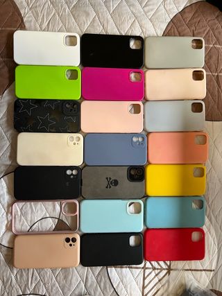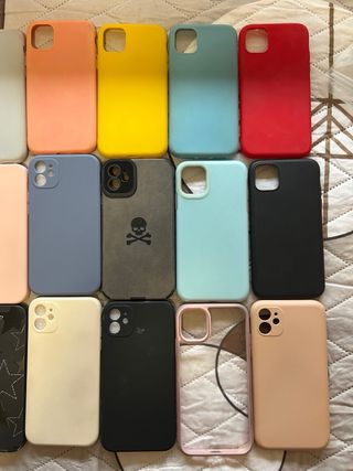 Variedad de fundas para iPhone 11. - Funda blanca - Funda negra - Funda gris - Funda verde lima - Funda rosa fucsia - Funda beige - Funda negra con estrellas - Funda rosa palo - Funda gris claro - Funda crema - Funda azul - Funda coral - Funda negra con calavera - Funda amarilla - Funda transparente con borde rosa - Funda azul claro - Funda beige - Funda negra - Funda roja