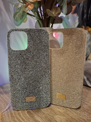 Funda para iPhone 12 con un diseño brillante y elegante. - Funda con incrustaciones. - Detalle de placa metálica. Te doy un descuento si compras dos fundas a la vez. Precio por pieza