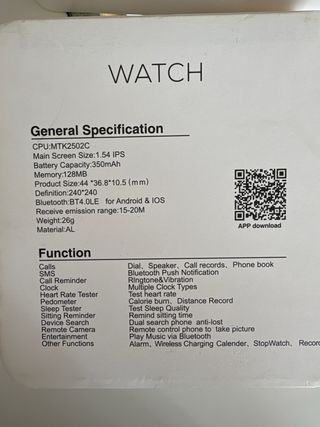 Reloj deportivo inteligente con diseño moderno. - Carga inalámbrica - Comunicaciones libres - Batería de gran capacidad - Modo paso - Gestión de salud Es chino, no se la marca. Se conecta con iphone
