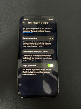 iPhone 13 con 84% de capacidad máxima de batería. - Capacidad máxima de batería: 84% - Carga optimizada activada -Funda iphone color verde agua