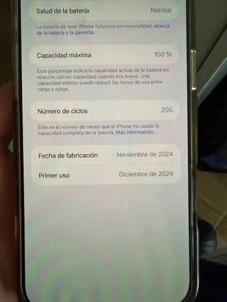 iPhone 16 Pro Max en color negro con 256GB de almacenamiento. Usado siempre con funda protectora, protector de pantalla y cámara. Está como nuevo, lo vendo porque he cambiado al 17. - Capacidad máxima de batería: 100% - Número de ciclos: 205 - Fecha de fabricación: Noviembre de 2024 - Primer uso: Diciembre de 2024 - Precio no negociable