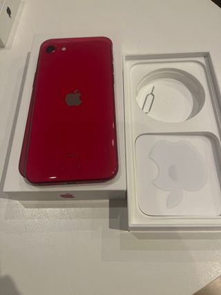 Teléfono móvil iPhone SE en color rojo. - Diseño elegante y compacto. - Cámara trasera de alta calidad. - Logo de Apple en la parte trasera.