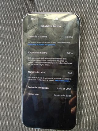 iPhone 15 con estado de batería al 88% de su capacidad máxima. - Capacidad máxima de la batería: 88% - Número de ciclos de la batería: 510 - Fecha de fabricación: Junio de 2024 - Primer uso: Octubre de 2024 - color blanco Precio negociable!