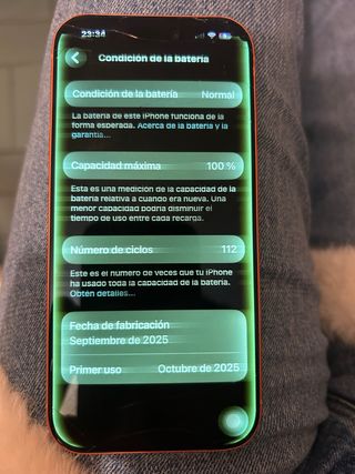 iPhone 17 Pro en color naranja. La batería se encuentra en perfecto estado, con capacidad máxima al 100% y solo 112 ciclos de uso. - Condición de la batería: Normal. - Capacidad máxima: 100%. - Número de ciclos: 112. - Fecha de fabricación: Septiembre de 2025. - Primer uso: Octubre de 2025.