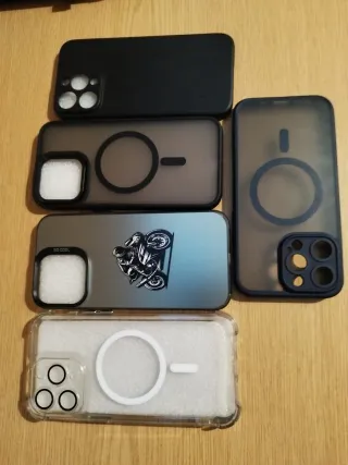 - Blanco roto con letras y detalles en azul oscuro, sin estrenar - Marrón chocolate con relieve de ondas, uso de 3 días - Rosa oscuro, tiene los bordes un poco desgastados - Transparente con compartimento para foto polaroid, es la funda que mas uso tiene y empieza a coger tono amarillento - Marron clarito/beige/crema nueva sin uso