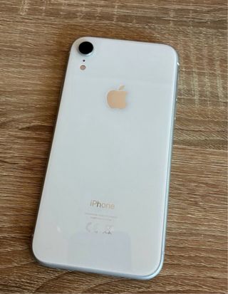 Teléfono móvil iPhone XR en color blanco. Tiene una rotura en la parte trasera pero funciona perfectamente.