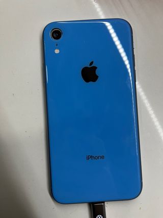 Teléfono móvil iPhone XR en color azul. Va bien pero la camra de atras esta rota cuando abres la camara de atras como que tiembla y el cristal de la camara se le callo