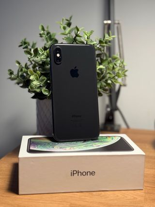 Teléfono móvil iPhone XS en color negro espacial con 64GB de almacenamiento. Salud de la batería al 100%, recién cambiada. Se entrega con todos los accesorios de la imagen. - Pantalla Super Retina HD. - Chip A12 Bionic. - Cámara dual de 12MP.