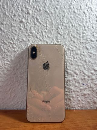 iPhone dorado con la pantalla rota. El teléfono muestra signos de uso y tiene grietas visibles en el cristal trasero. - Modelo: iPhone XS - Color: Dorado Hay un problema de que el móvil se enciende, pero tiene como la pantalla congelada y no se puede utilizar para piezas está perfecta y el arreglo que yo pregunté son 90 €