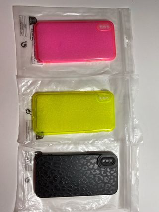 lote tres fundas para iphone XS . dos transparentes/fluorescentes una en rosa y otra en amarillo y la otra es negra de animals print.