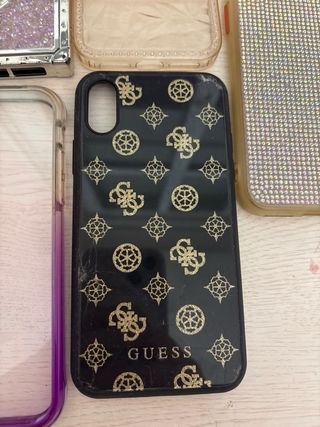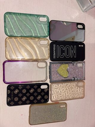Lote de fundas para iPhone XS. - Funda transparente con diseño de líneas verdes. - Funda transparente con diseño de líneas amarillas. - Funda con espejo y borde negro. - Funda negra con logo ICON y DSQUARED2. - Funda transparente con borde morado. - Funda con purpurina rosa y corazón amarillo. - Funda negra con logo GUESS. - Funda transparente con diseño floral. - Funda con incrustaciones de pedrería.