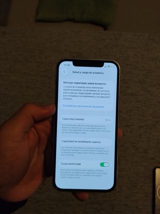 iPhone 12 con la parte trasera dañada. La pantalla funciona correctamente y la batería tiene un 87% de capacidad máxima. - Capacidad máxima de la batería: 87% - Carga optimizada activada