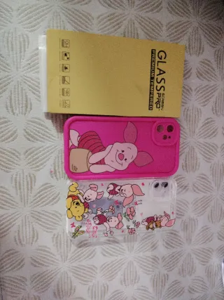 Set de accesorios para iPhone. - Funda rosa con diseño de Piglet. - Funda transparente con diseño de Winnie the Pooh y amigos. - Protector de pantalla de cristal templado.