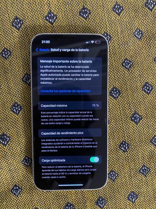 iPhone en color plata con un 85% de capacidad máxima de batería. - Capacidad máxima de la batería: 85% - Carga optimizada activada viene con caja cargador y una funda