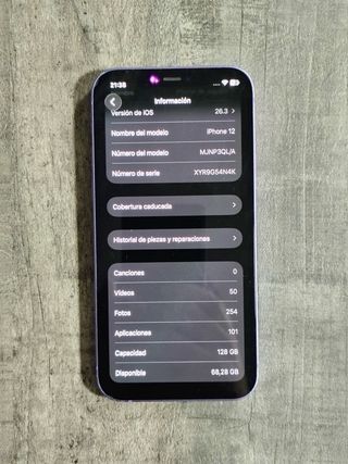 Teléfono móvil Apple iPhone 12. Color morado y versión de 128 Gb de almacenamiento. - Piezas originales, sin reparaciones. - Funciona todo perfectamente, todas las funciones y con la última versión de iOS. - Estado de la batería 78% - Estado general bueno, tiene típicas marcas de uso. - Entrego funda recién comprada y cable de carga, no conservo la caja. - Entrego formateado, libre de iCloud. Trato en mano.