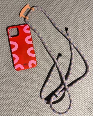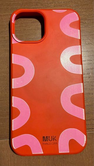 Funda para móvil MUK de color rojo con diseño de arcos en rosa. Incluye una cuerda colgante a juego. - Diseño llamativo y moderno. - Cuerda ajustable para llevar el móvil cómodamente. Para IPHONE 14
