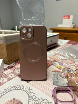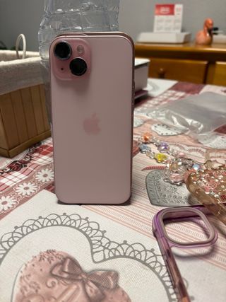 Teléfono móvil iPhone 15 en color rosa oro. - Diseño elegante y moderno. - Acabado metálico brillante. -Como nuevo -89% de bateria -Esta como nuevo -No tiene ningun fallo -incluye 6 fundas del iPhone -Cargador no original -Precio negociable