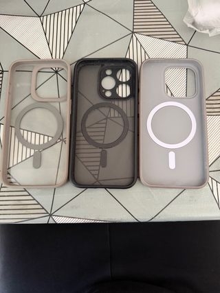 Conjunto de tres fundas protectoras para iPhone 15 Pro. - Funda transparente con borde beige. - Funda semitransparente negra. - Funda semitransparente gris con borde naranja.