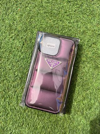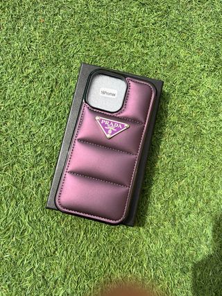Funda de teléfono de la marca Prada en color lila, con un diseño acolchado y el icónico logo triangular. - La caja es un plus de 2€ que no va incluido en el precio - Diseño acolchado. - Logo triangular de la marca.