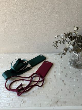 Pack de dos fundas para iPhone 7/8, una en color verde bosque y otra en color burdeos. - Funda verde con correa ancha. - Funda burdeos con cordón ajustable.