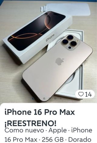 iPhone 16 Pro Max en color Dorado, con 256GB de almacenamiento. Se encuentra en perfecto estado, como nuevo. Solo trato mamo metalico - Capacidad: 256 GB - Color: desert gold Caja cable impolutoooo como nuevo Garantia 1º año de apple hasta agosto 2026
