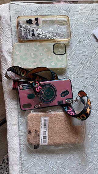 Conjunto de fundas para iPhone 11. - Funda transparente con diseño de Karl Lagerfeld y purpurina. - Funda con estampado de leopardo en tonos menta. - Funda rosa con diseño de cámara y correa. - Funda de peluche en color beige.