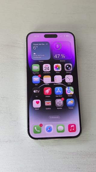 Teléfono móvil iPhone 14 Pro en color negro. 256GB El dispositivo ha tenido sustitución de batería hace aproximadamente 3 meses. La batería no es original de Apple y presenta una autonomía inferior a la esperada, por lo que no suele llegar al final del día con un uso normal y veces se apaga. Habría que echarle un ojo en un servicio técnico. 📸 Pantalla, carcasa y cámaras en perfecto estado. 📦 Incluye caja original.