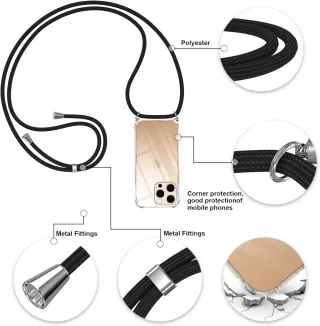 03328. NUEVA. Funda para iPhone 16 Pro MAX con Cuerda, Carcasa Transparente Silicona Colgar Collar Correa de Cuello Cadena Cordón para iPhone 16 Pro MAX 6.9" Fundas, Cordón Ajustable Negro.