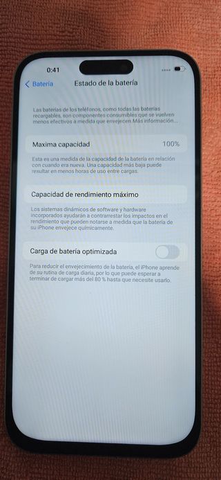 iPhone 17 Pro Max con 1TB de almacenamiento. - Capacidad máxima de la batería al 100%. - Carga de batería optimizada activada.