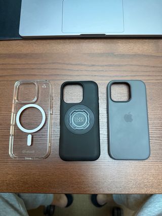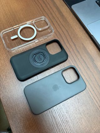 Conjunto de fundas para iPhone 14 Pro. - Funda transparente con MagSafe. - Funda negra con sistema Quad Lock y MagSafe - Funda original Apple gris con MagSafe