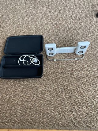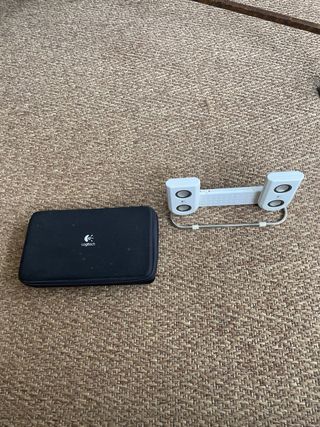 Altavoces blancos de la marca Logitech, diseñados para iPhone. Incluyen su funda protectora y cable de carga. - Diseño compacto y portátil. - Funda de transporte incluida. - Cable de conexión.