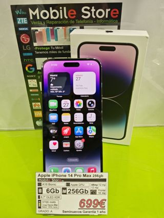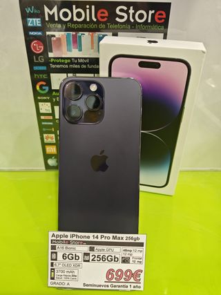 Apple iPhone 14 Pro Max de 256GB en excelente estado, la batería está recién cambiada, con garantía de 1 año. Todos nuestros artículos de segunda mano han sido testeados debidamente para comprobar su correcto funcionamiento. Damos 1 año de garantía en artículos usados y 3 años en artículos nuevos. Quieres verlos? Pásate por alguna de nuestras tiendas en Málaga: Av. de la Aurora, 19 Calle Armengual de la Mota, 10 Teléfono (Whatsapp): 627 119 234 Compramos también teléfonos, incluso con avería. Nuestras valoraciones nos avalan.