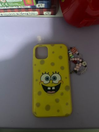 Funda amarilla con diseño de Bob Esponja y lunares. - Compatible con iPhone XR y iPhone 11. - Incluye un accesorio de cuentas.