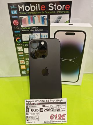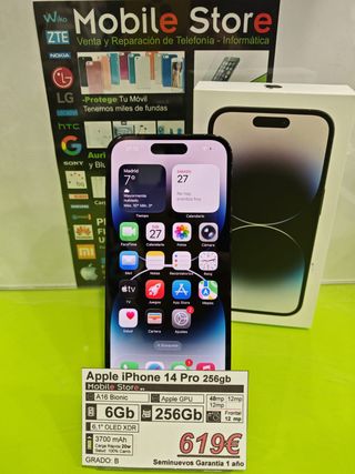 Apple iPhone 14 Pro de 256GB en color negro, batería recién cambiada. El estado es bueno, tiene leves marcas en el marco típicas del uso de la funda. Todos nuestros artículos de segunda mano han sido testeados debidamente para comprobar su correcto funcionamiento. Damos 1 año de garantía en artículos usados y 3 años en artículos nuevos. Quieres verlos? Pásate por alguna de nuestras tiendas en Málaga: Av. de la Aurora, 19 Calle Armengual de la Mota, 10 Teléfono (Whatsapp): 627 119 234 Compramos también teléfonos, incluso con avería. Nuestras valoraciones nos avalan.