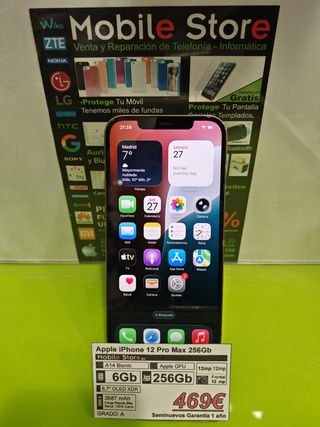 Apple iPhone 12 Pro Max con 256GB de almacenamiento en color oro. Modelo de seminuevo en buen estado general, batería recién cambiada con garantía de 1 año. Todos nuestros artículos de segunda mano han sido testeados debidamente para comprobar su correcto funcionamiento. Damos 1 año de garantía en artículos usados y 3 años en artículos nuevos. Quieres verlos? Pásate por alguna de nuestras tiendas en Málaga: Av. de la Aurora, 19 Calle Armengual de la Mota, 10 Teléfono (Whatsapp): 627 119 234 Compramos también teléfonos, incluso con avería. Nuestras valoraciones nos avalan.