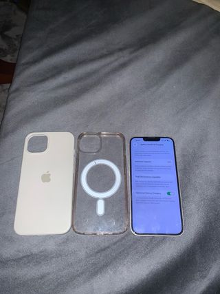 Se vende iPhone 13 en color plata junto con dos fundas protectoras. - Funda transparente con MagSafe. - Funda rígida color crema.